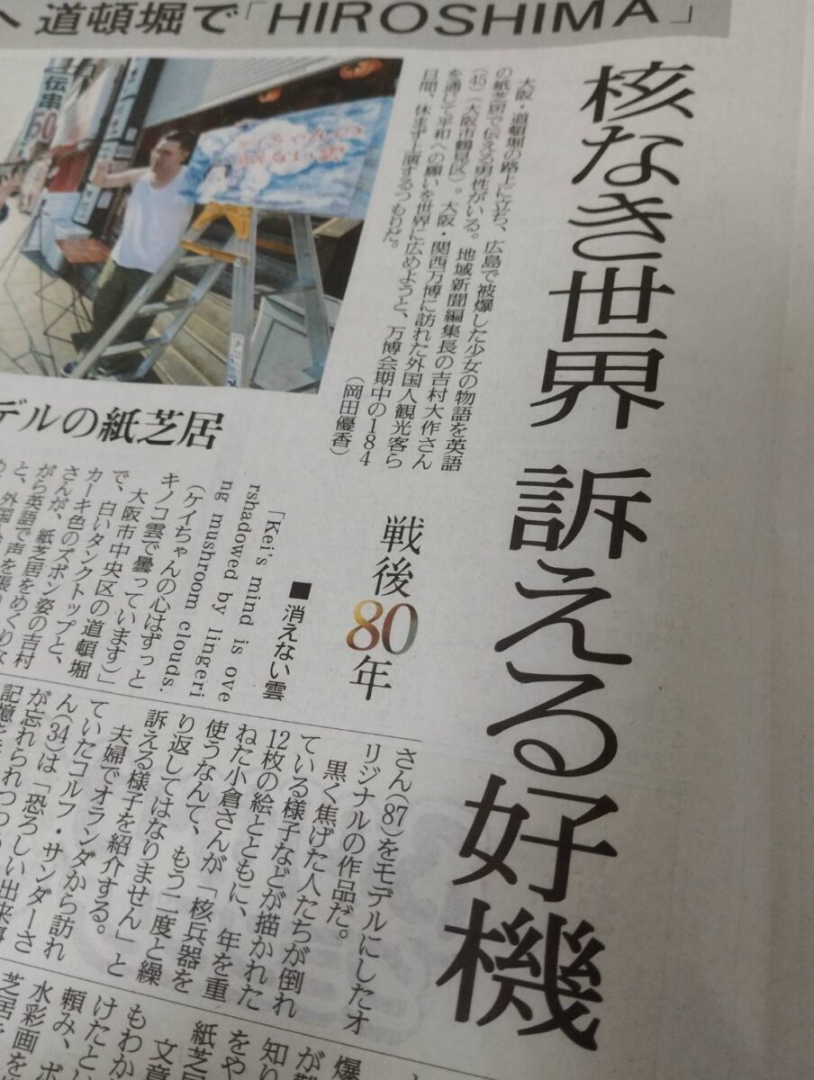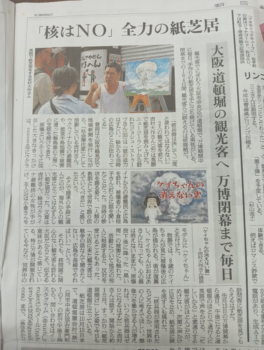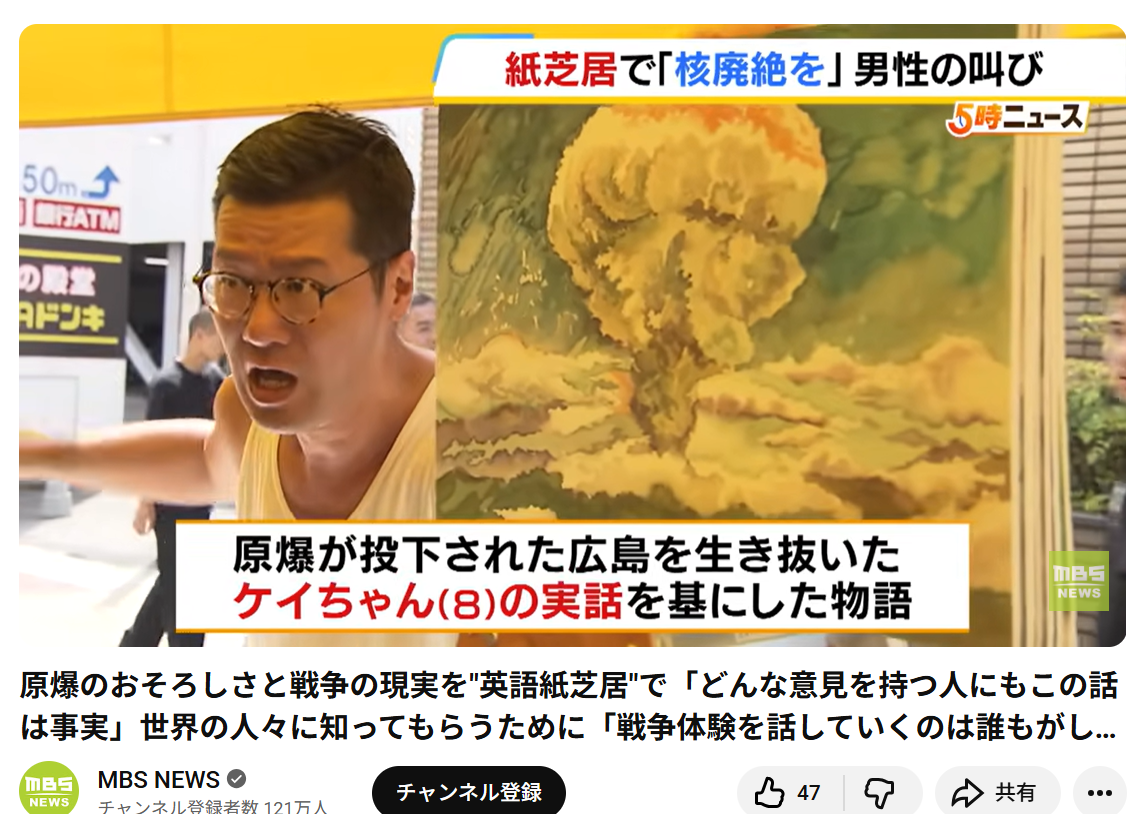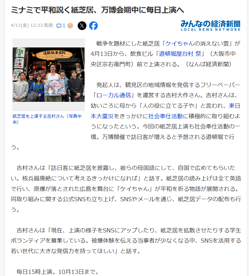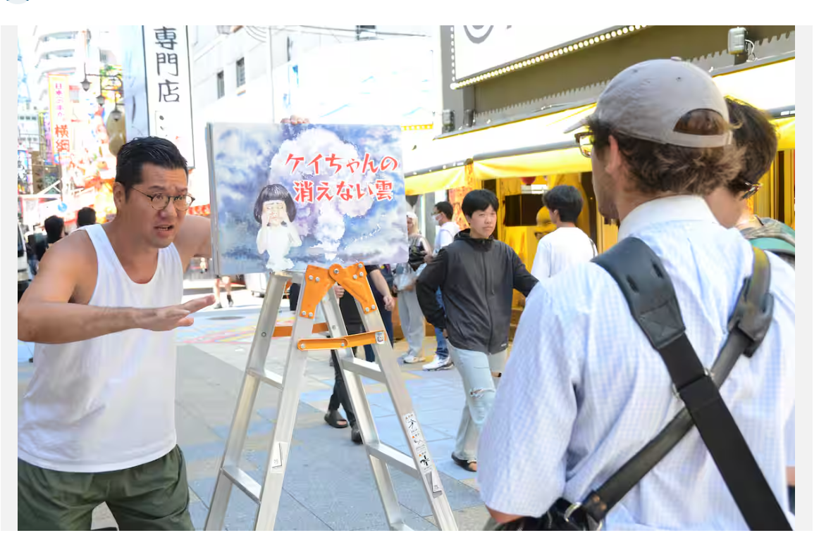 At the World Expo site in Dotonbori, “HIROSHIMA”… a kamishibai featuring a model of an atomic bomb survivor girl was performed in English, and also shared on social media. 万博客へ道頓堀で「HIROSHIMA」…被爆少女モデルの紙芝居を英語で上演、SNSでも発信